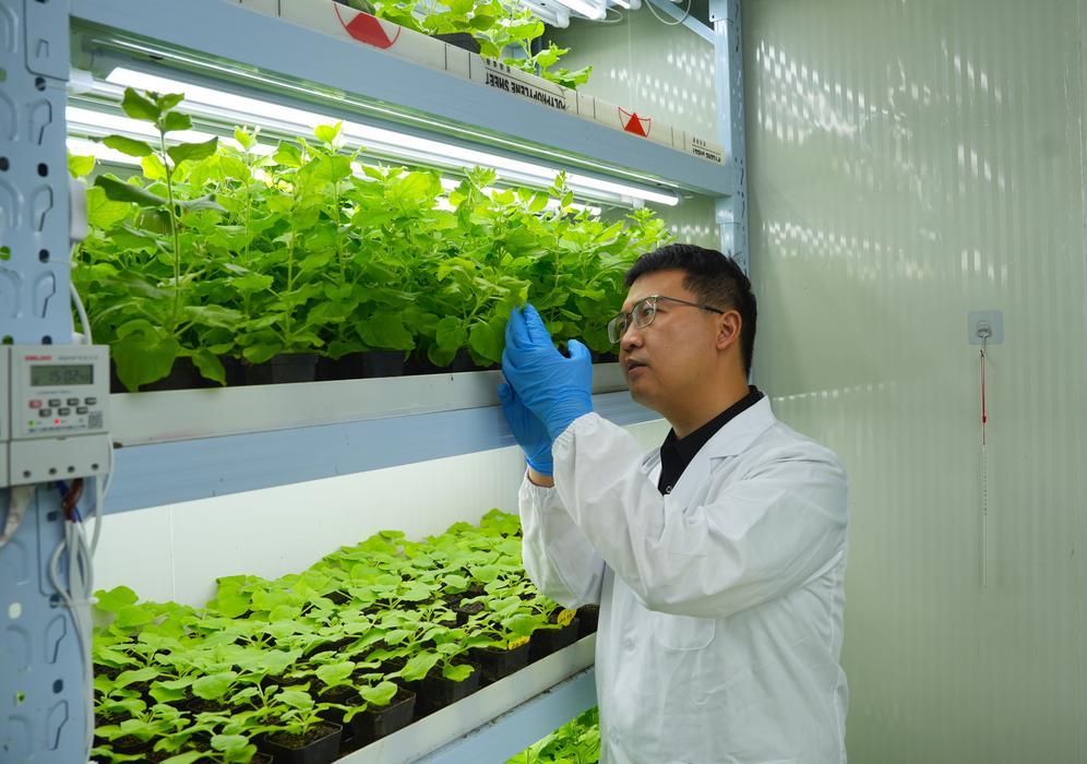 神筆生物創(chuàng)始人李仁漢在實(shí)驗(yàn)室觀(guān)察發(fā)光植物生長(zhǎng)情況(10月10日攝)。新華社發(fā)