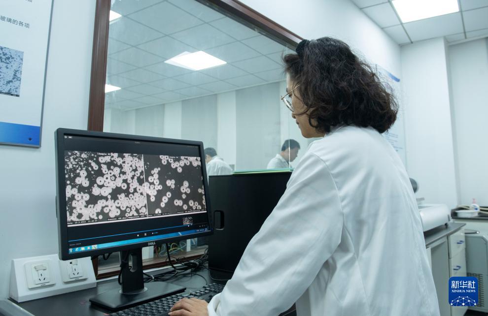 研究人員在浮法玻璃新技術國家重點實驗室內利用顯微鏡觀察空心玻璃微珠(11月8日攝)。