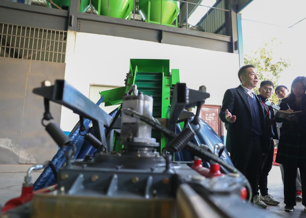 11月27日,在湖南省婁底市雙峰縣,湖南省農(nóng)友機械集團有限公司負責(zé)人劉若橋(左一)向來訪者介紹一款油茶果采收機。新華社記者王婧嬙 攝