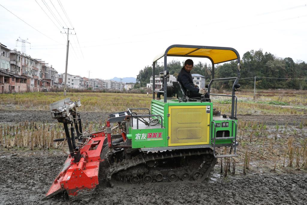 11月26日,在湖南省婁底市雙峰縣荷葉鎮(zhèn),一名農(nóng)機手在駕駛旋耕機旋耕土地。新華社記者王婧嬙 攝