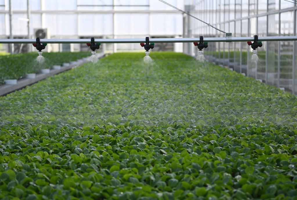 12月2日,在謝徑安·傳化農(nóng)創(chuàng)村植物科學(xué)中心里,自動(dòng)噴灌系統(tǒng)在數(shù)字種苗工廠(chǎng)內(nèi)灌溉育苗。新華社記者 盧哲 攝