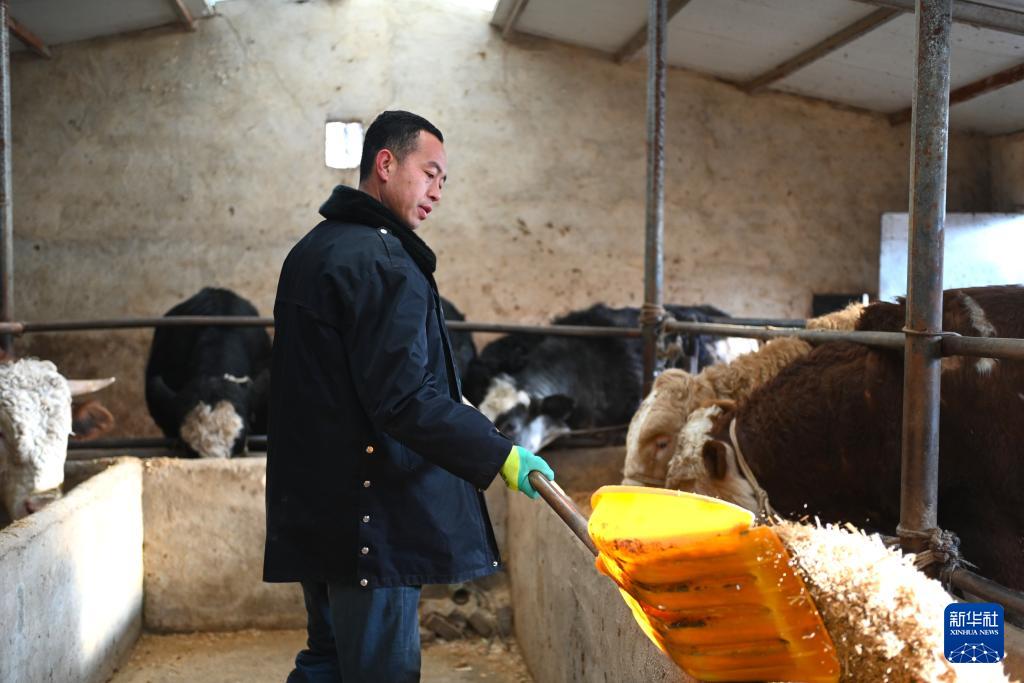 1月7日,農(nóng)戶在寧夏固原市涇源縣自家牛棚給牛添加飼料。