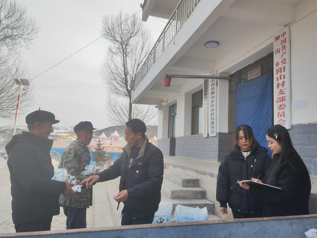 春節(jié)期間,白文英(右二)、趙永和(右三)與趙懷杰(左一)給村民發(fā)放物資。新華社記者 崔翰超 攝