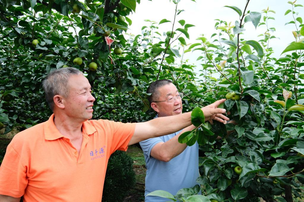 莫日發(fā)(右)在梨園檢查梨子長(zhǎng)勢(shì)。新華社記者 鄒雨沁 攝