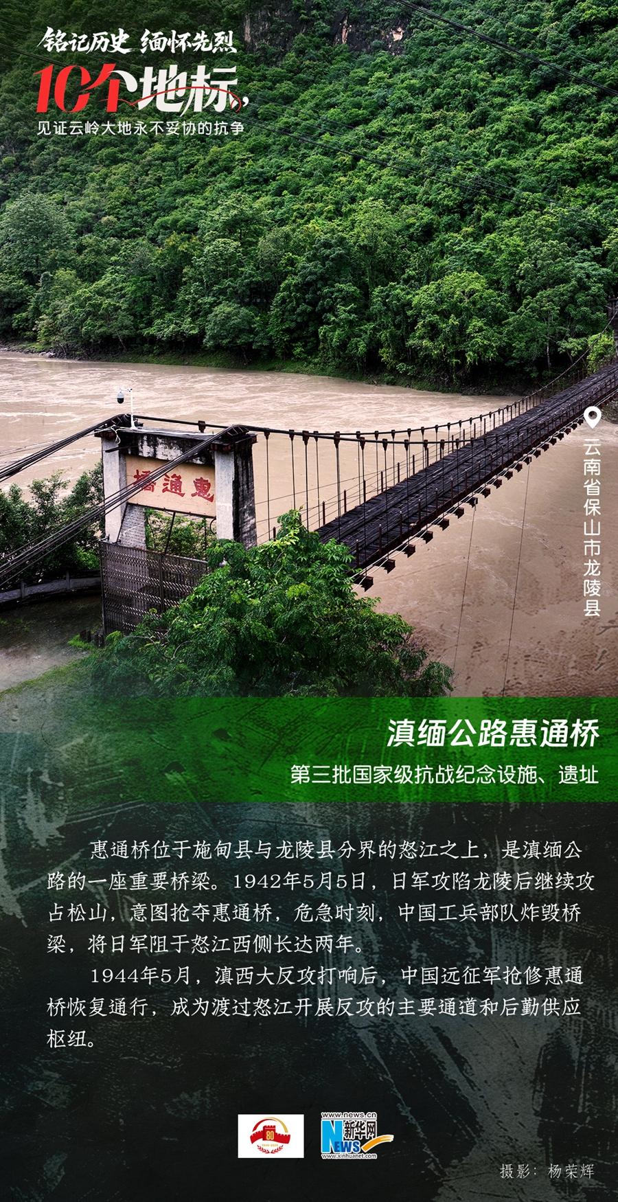 80年過去,曾經(jīng)的戰(zhàn)場硝煙雖散,但英氣永存。在國務(wù)院公布的前三批國家級抗戰(zhàn)紀念設(shè)施、遺址名錄中,云南省共有10個,分別為騰沖國殤墓園、騰沖滇西抗戰(zhàn)紀念館,龍陵抗日戰(zhàn)爭紀念館,國立西南聯(lián)合大學(xué)舊址,抗戰(zhàn)勝利紀念堂,松山戰(zhàn)役舊址,南洋華僑機工回國抗日紀念碑,怒江駝峰航線紀念館,施甸縣抗日江防遺跡群,滇緬公路惠通橋,滇西抗日戰(zhàn)爭紀念碑。它們承載著國人共同的歷史記憶與民族情感,也為我們學(xué)習(xí)和傳承抗戰(zhàn)精神提供了現(xiàn)實條件。