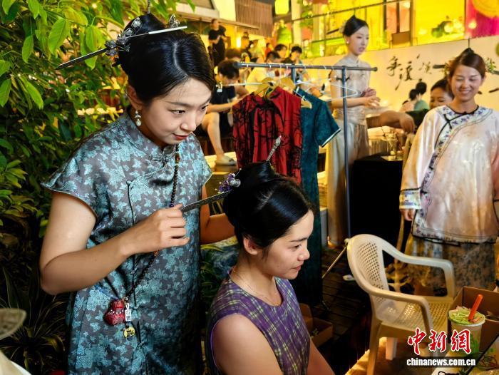 8月23日晚,福州煙臺山歷史風(fēng)貌區(qū)的街巷熙熙攘攘,游客摩肩接踵。在鹽倉的三條簪非遺體驗現(xiàn)場,工作人員正在給一位女孩邊梳妝邊講解頭飾背后的文化寓意,不少路過的游客圍攏觀看,有的女孩也在一旁躍躍欲試。