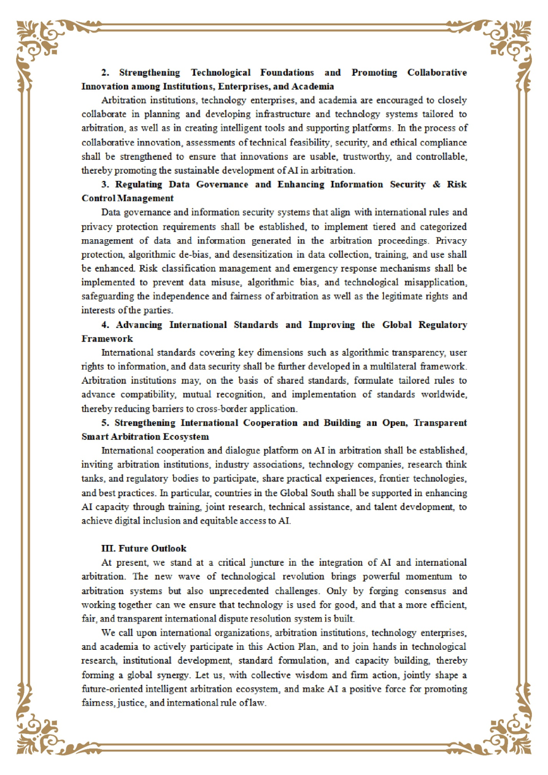 有鑒于此,貿(mào)仲于本次論壇正式形成并發(fā)布《行動(dòng)計(jì)劃》,系統(tǒng)闡述了人工智能與國(guó)際仲裁融合發(fā)展的方向與路徑?!缎袆?dòng)計(jì)劃》明確提出四大合作目標(biāo):一是包容共享、彌合鴻溝,推動(dòng)全球仲裁機(jī)構(gòu)間技術(shù)交流與能力建設(shè);二是尊重權(quán)利、保障程序,確保仲裁程序的獨(dú)立性與正當(dāng)性;三是提升透明、促進(jìn)公正,推動(dòng)人工智能應(yīng)用適度披露;四是協(xié)同治理、構(gòu)建標(biāo)準(zhǔn),倡導(dǎo)制定國(guó)際共識(shí)與規(guī)則。同時(shí),《行動(dòng)計(jì)劃》提出五方面合作框架:一是拓展應(yīng)用場(chǎng)景,探索“人工智能+仲裁”的融合模式;二是夯實(shí)技術(shù)基礎(chǔ),推動(dòng)機(jī)構(gòu)、企業(yè)與學(xué)術(shù)界協(xié)同創(chuàng)新;三是規(guī)范數(shù)據(jù)治理,強(qiáng)化信息安全與風(fēng)險(xiǎn)防控;四是推進(jìn)國(guó)際標(biāo)準(zhǔn)制定,完善全球規(guī)則體系;五是加強(qiáng)國(guó)際交流合作,共建開放透明的智能仲裁生態(tài),特別關(guān)注全球南方國(guó)家的能力提升與數(shù)字普惠。《行動(dòng)計(jì)劃》指出,人工智能與國(guó)際仲裁的融合發(fā)展正處在重要關(guān)口。唯有凝聚共識(shí)、攜手合作,方能確保技術(shù)向善而行,推動(dòng)建立更加高效、公正、透明的國(guó)際爭(zhēng)議解決體系。