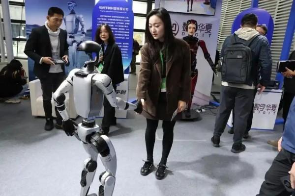 2024年“互聯(lián)網(wǎng)之光”博覽會上,觀眾與人形機(jī)器人互動。