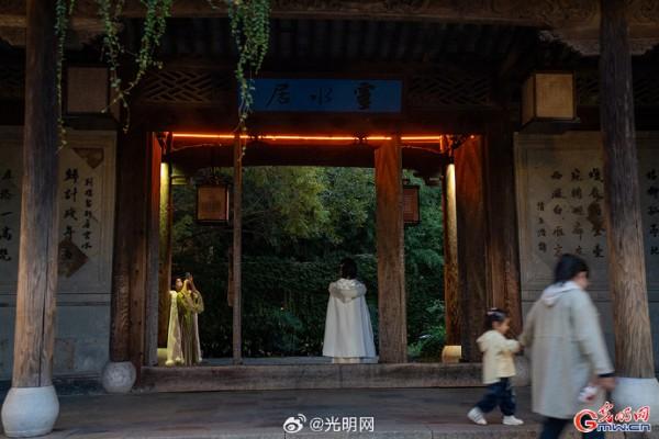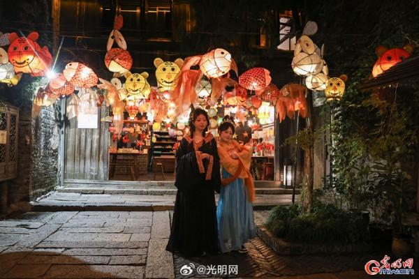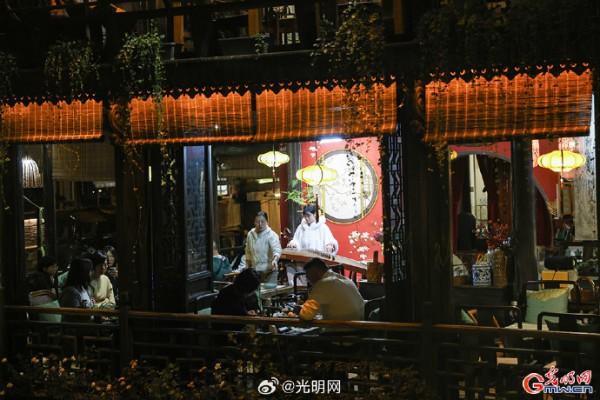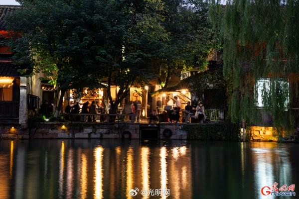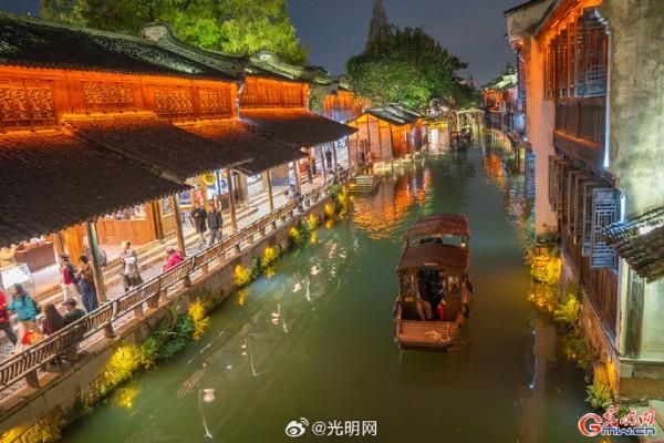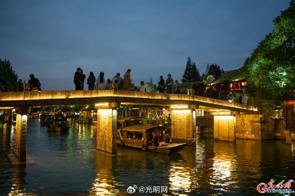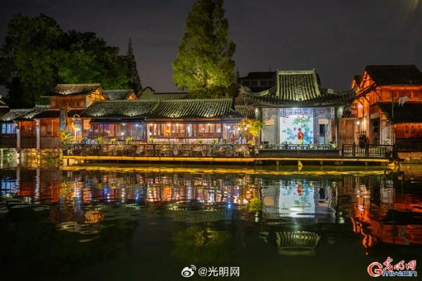 隨著夜幕降臨,河道兩岸燈光點綴,烏篷船緩緩劃過,水面映射出絢麗色彩。當暮色浸染白墻黛瓦,烏鎮(zhèn)從素簡水墨畫蛻變?yōu)榱鞴庖绮实臄?shù)字夢境。