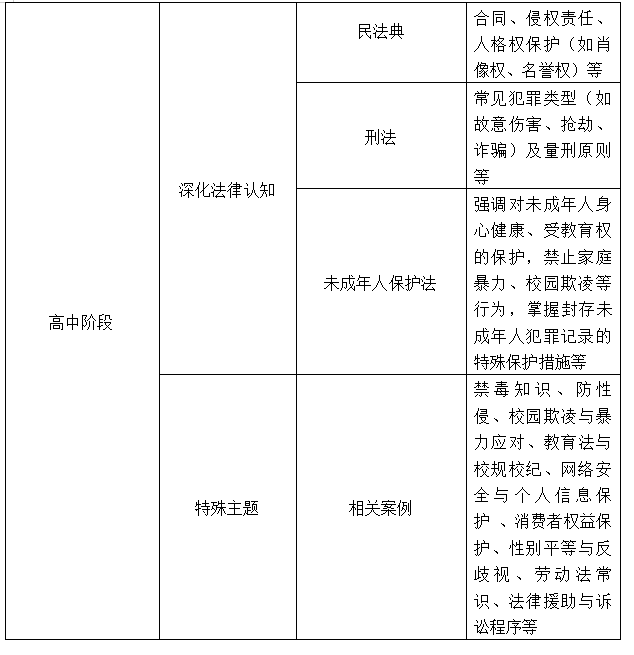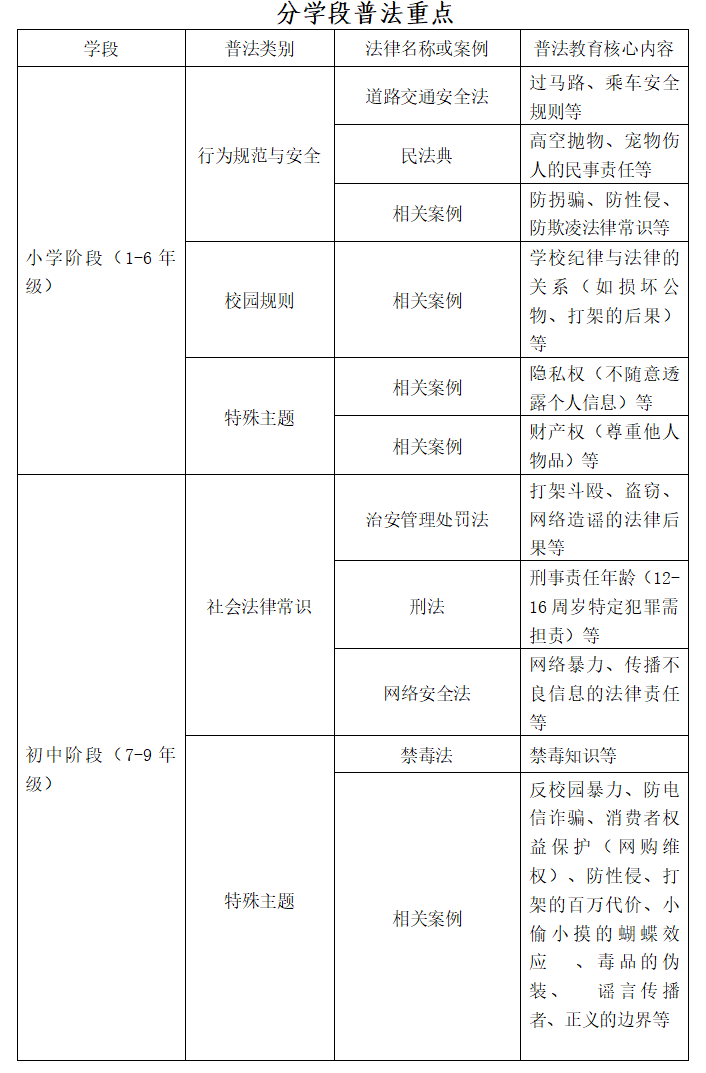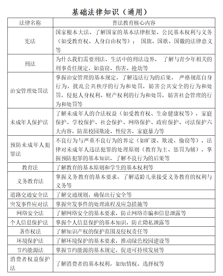 普法教育應針對不同年齡段的學生開展有實效的普法教育,充分考慮不同年齡段的學生特點,提供定制化的普法教育內(nèi)容。普法內(nèi)容必須保持時效性與前瞻性,普法教育者應及時關注最新的法律法規(guī)和司法實踐成果,并將其融入到校園普法教育中,為學生提供最新、最準確的法律知識。以下是學校中小學生普法教育核心內(nèi)容清單之一,供參考。