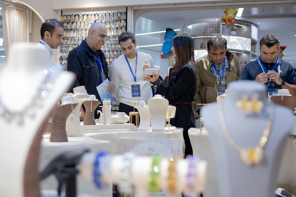 2025年10月27日,外國(guó)商人在浙江義烏第六代市場(chǎng)全球數(shù)貿(mào)中心進(jìn)行采購(gòu)洽談。(吳峰宇 攝)