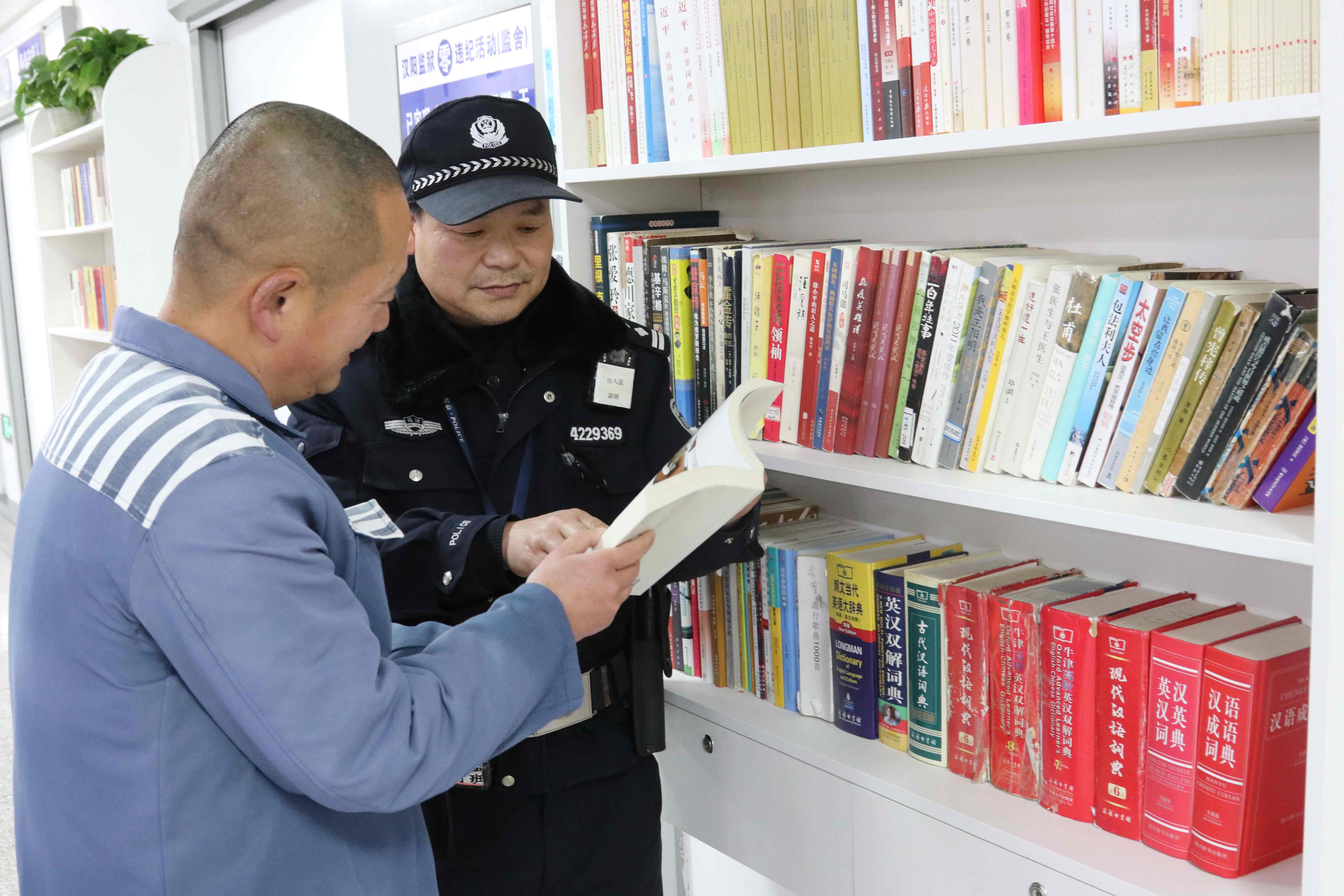圖為湖北省漢陽(yáng)監(jiān)獄出入監(jiān)監(jiān)區(qū)民警與罪犯在監(jiān)舍書柜旁挑選書籍。