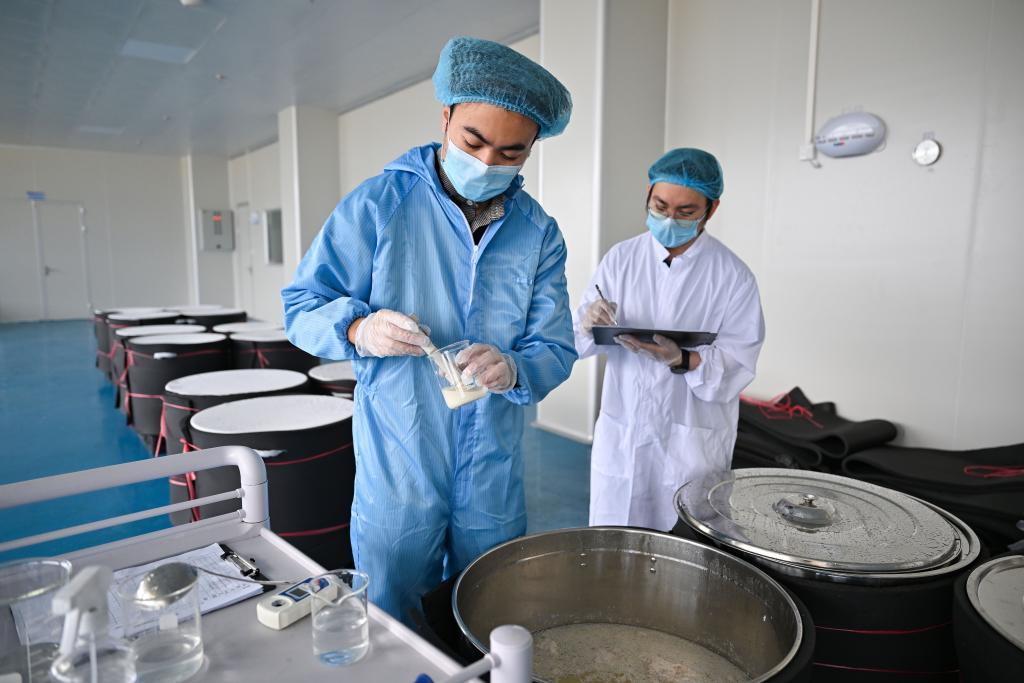 2026年1月28日,海南文昌溪北邦興食品科技有限公司糟粕醋加工廠的工作人員正在對糟粕醋進行采樣檢測。新華社記者郭程 攝
