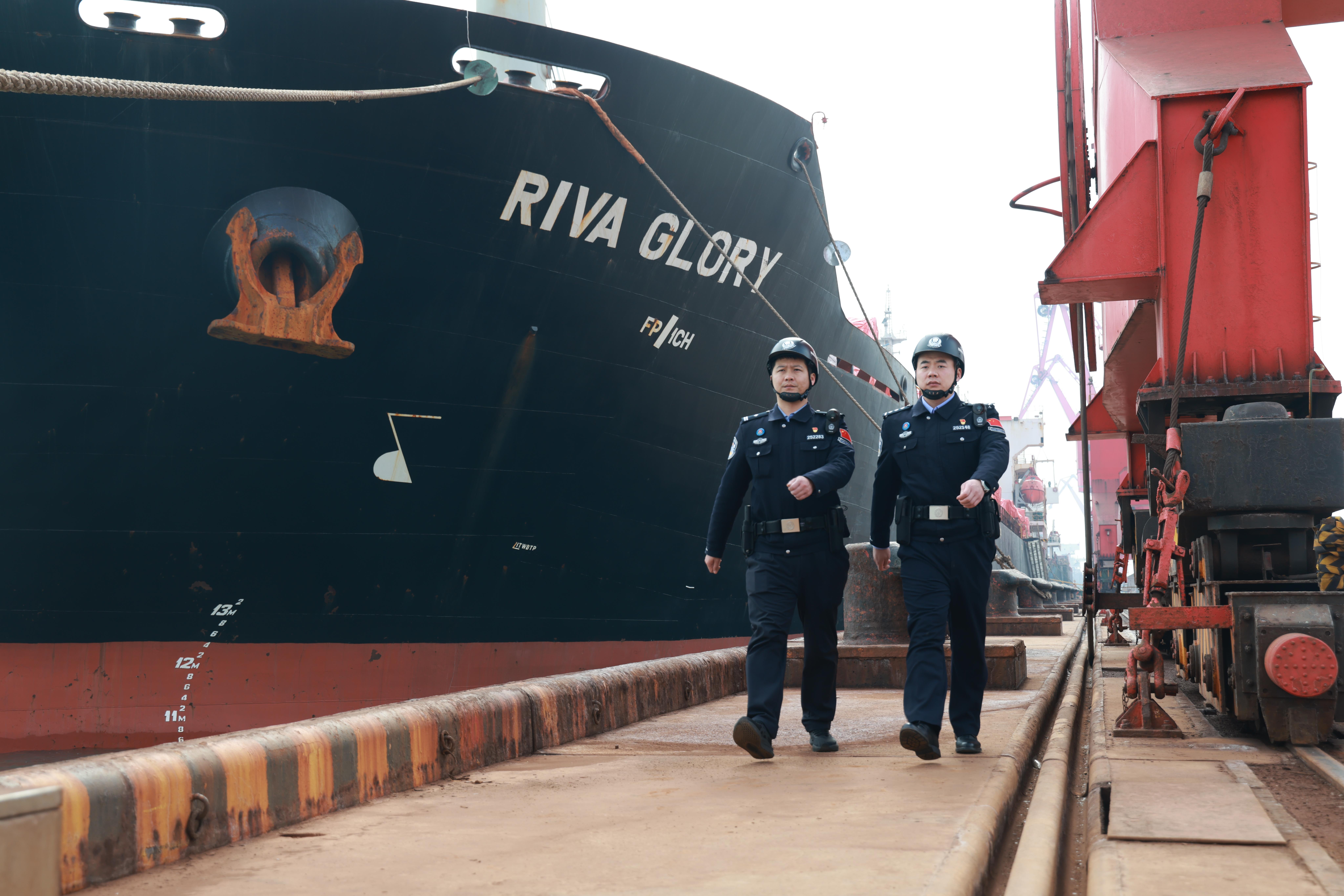 2月10日,天剛放亮,該站執(zhí)勤三隊(duì)民警周威成、王學(xué)兵正在巴拿馬籍“瑞福”輪旁巡查。這艘名字里自帶“年味兒”的貨輪,正忙著裝載國產(chǎn)鋼材、工程設(shè)備和各類車輛,整裝待發(fā)奔赴阿聯(lián)酋,將“中國制造”送往共建“一帶一路”國家。