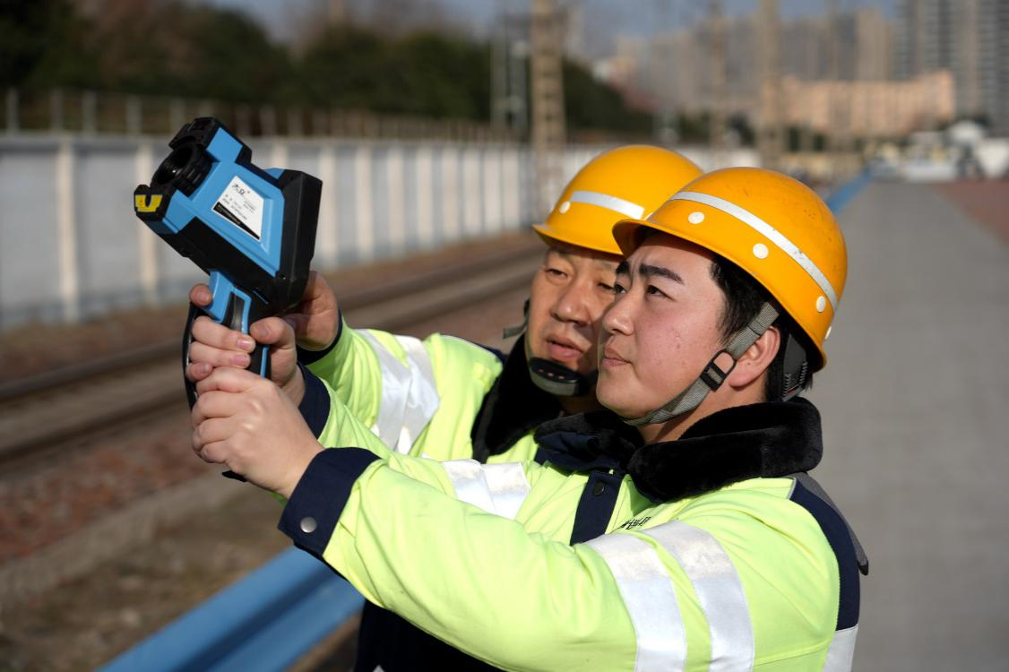 圖為李家民(左)和閆建偉(右)使用紅外熱成像儀對接觸網(wǎng)設(shè)備進行測溫。