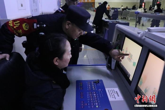民警裴保軍督導(dǎo)客運職工對旅客攜帶可疑物品進行檢查。許晶 攝