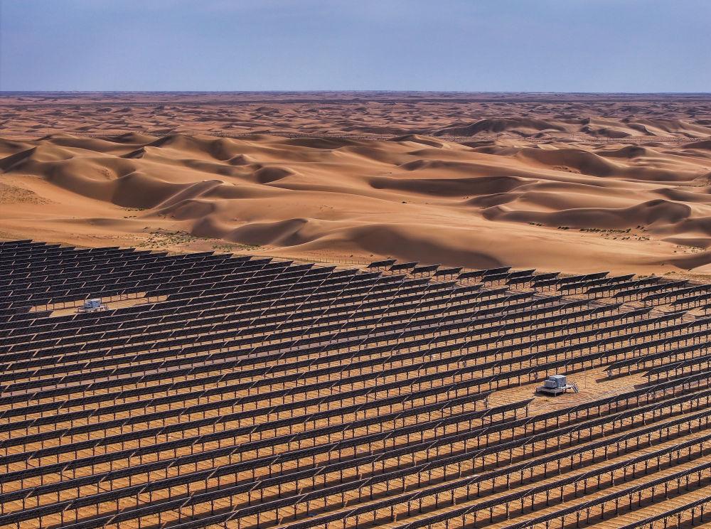 這是2025年6月5日拍攝的位于內(nèi)蒙古巴彥淖爾市磴口縣的烏蘭布和東北部新能源基地100萬(wàn)千瓦光伏先導(dǎo)工程項(xiàng)目(無(wú)人機(jī)照片)。該項(xiàng)目地處烏蘭布和沙漠。新華社記者 連振 攝