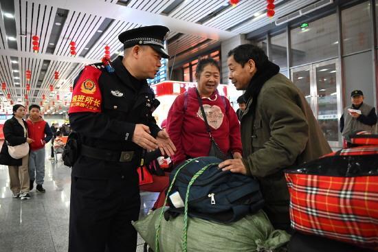 圖為林芳德在站廳內(nèi)向旅客講解出行安全注意事項(xiàng)。