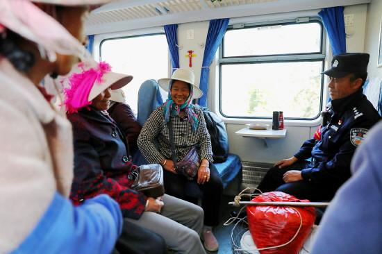 圖為乘警李學(xué)忠(右)和乘車的村民聊天。 唐明龍 攝