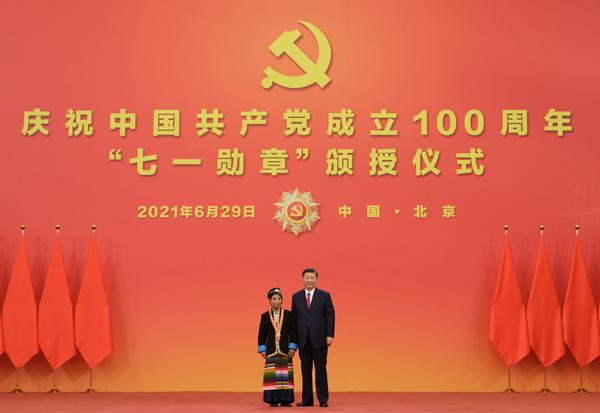 6月29日,慶祝中國共產(chǎn)黨成立100周年“七一勛章”頒授儀式在北京人民大會堂金色大廳隆重舉行。中共中央總書記、國家主席、中央軍委主席習(xí)近平向“七一勛章”獲得者卓嘎頒授勛章。新華社記者?李學(xué)仁?攝