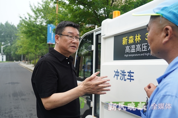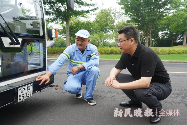 圖說:諸巨明代表(右)實地調(diào)研環(huán)衛(wèi)車輛。新民晚報首席記者 劉歆 攝