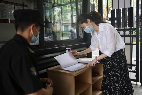 馬當(dāng)路278弄,西成里大門口,黃浦區(qū)人大代表、淮海中路街道西成居委會(huì)主任戴瑾正在跟門衛(wèi)袁師傅核對(duì)進(jìn)入人員信息。