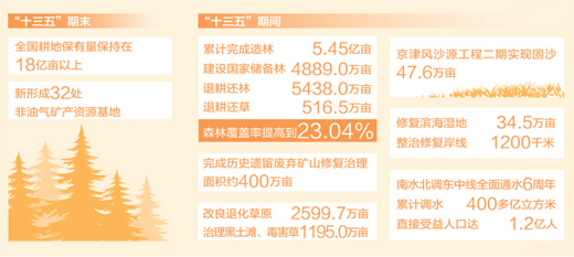 各類自然資源保護(hù)狀況總體良好。“十三五”期末,全國耕地保有量保持在18億畝以上,為確保谷物基本自給、口糧絕對安全提供耕地資源保障。新形成32處非油氣礦產(chǎn)資源基地,錳、鋰、石墨等戰(zhàn)略性礦產(chǎn)儲量大幅增長,勘探發(fā)現(xiàn)瑪湖等17個億噸級大油田,安岳等21個千億立方米級大氣田?!笆濉逼陂g,累計(jì)完成造林5.45億畝,建設(shè)國家儲備林4889.0萬畝,退耕還林5438.0萬畝,退耕還草516.5萬畝,森林覆蓋率提高到23.04%;完成歷史遺留廢棄礦山修復(fù)治理面積約400萬畝;改良退化草原2599.7萬畝,治理黑土灘、毒害草1195.0萬畝;京津風(fēng)沙源工程二期實(shí)現(xiàn)固沙47.6萬畝;修復(fù)濱海濕地34.5萬畝,整治修復(fù)岸線1200千米。南水北調(diào)東中線全面通水6周年,累計(jì)調(diào)水400多億立方米,直接受益人口達(dá)1.2億人。地質(zhì)災(zāi)害造成死亡(失蹤)人數(shù)和直接經(jīng)濟(jì)損失較“十二五”期間分別減少38.5%和41.5%。