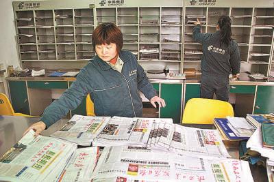 趙明翠每次投遞的報刊重達幾十公斤,分揀量很大。圖為她正在對要投遞的報刊進行分揀。
