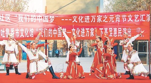 “火紅的燈籠掛起來,熱鬧的燈謎猜起來,甜蜜的元宵吃起來。”2月14日元宵節(jié)前夕,新疆維吾爾自治區(qū)吐魯番市高昌區(qū)政協(xié)“訪惠聚”駐廣匯社區(qū)工作隊(duì)組織轄區(qū)群眾開展“我們的中國(guó)夢(mèng)”文化進(jìn)萬家之元宵節(jié)文藝演出活動(dòng),共迎元宵佳節(jié)。 壽偉 攝