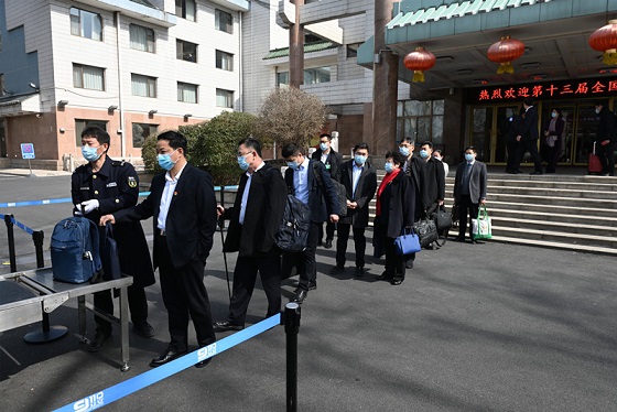 全國(guó)人大代表抵達(dá)駐地賓館——中國(guó)職工之家,并做核酸檢測(cè)。