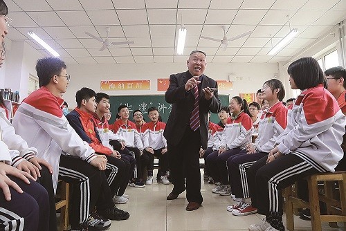 近日,山東省高密市政協(xié)開展“政協(xié)講堂進校園”活動,組織界別委員深入全市中小學校,為學生講解黨史知識,增進愛黨愛國愛家鄉(xiāng)的深厚情懷。圖為市政協(xié)委員、市曲藝團團長栗瑞杰為高密二中的學生表演快書自編曲目《百年風雨話滄?!?。 李淼 攝