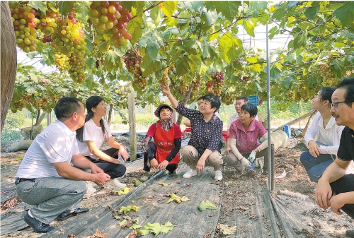 秦光蔚(左四)帶領(lǐng)科技人員為種植大戶講解葡萄種植技術(shù)