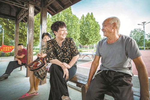 葛樹(shù)芹(右二)和村民在村中心公園里拉家常。孫瑩?攝