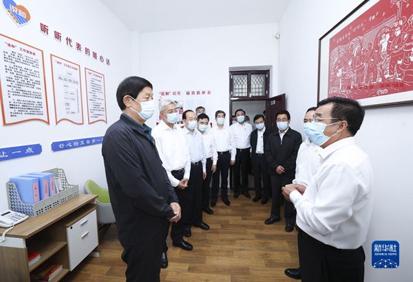 8月26日至28日,中共中央政治局常委、全國人大常委會委員長栗戰(zhàn)書在甘肅就黃河保護(hù)法立法進(jìn)行調(diào)研。這是8月26日,栗戰(zhàn)書在慶陽市西峰區(qū)后官寨鎮(zhèn)人大代表之家調(diào)研。新華社記者?龐興雷?攝