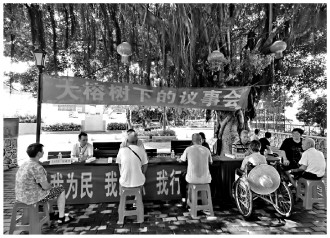 在廣東省江門市人大常委會“榕樹下議事會”上,市人大代表面對面聽取群眾意見建議。