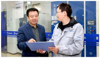 圖為全國人大代表周善紅(左)在江蘇某電氣公司調(diào)研。