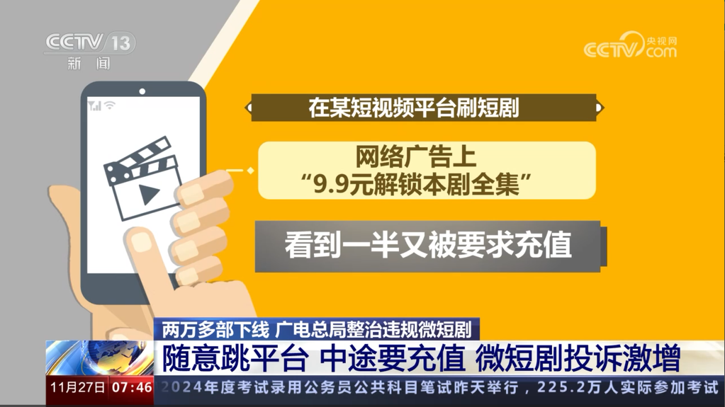 兩萬多部下線 廣電總局整治違規(guī)微短劇 隨意跳平臺 中途要充值 微短劇投訴激增