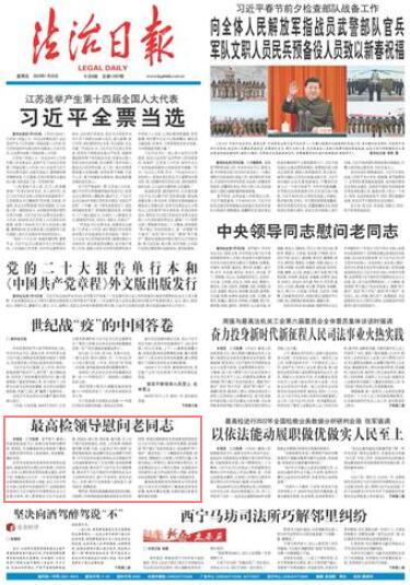 本報(bào)訊 記者張昊 春節(jié)前夕,最高人民檢察院黨組書記、檢察長張軍慰問韓杼濱、賈春旺,代表最高檢和全體檢察干警衷心祝愿老領(lǐng)導(dǎo)和家人新春愉快、身體健康、闔家幸福。