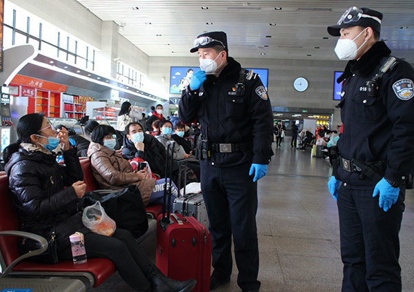 錢一鳴帶領民警在候車廳巡視,提示旅客做好個人防護。徐偉倫 攝