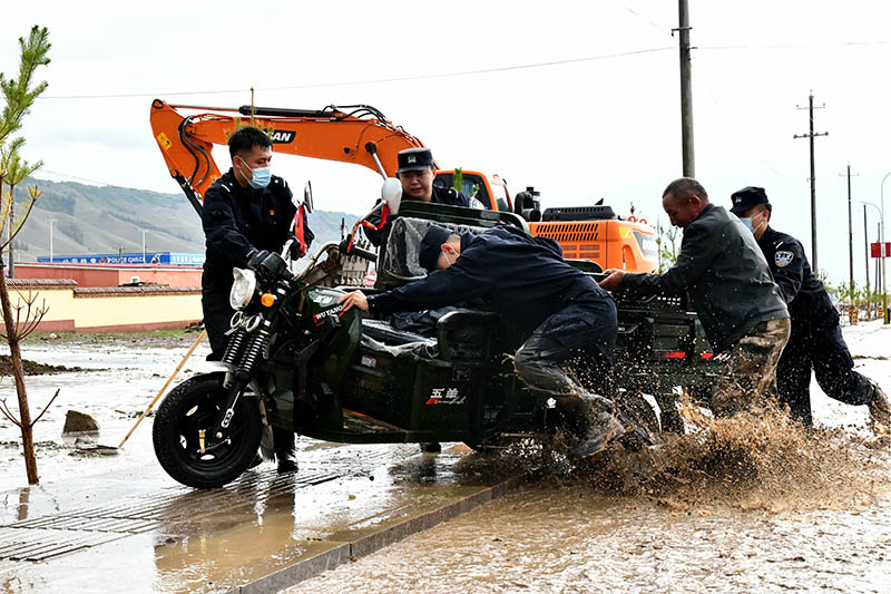 7月15日,新疆哈密市伊吾縣前山鄉(xiāng)出現(xiàn)雷雨天氣,隨后突降暴雨,17時(shí)10分許,由于降水量逐漸增大引發(fā)洪水,駐守在哈密市伊吾縣前山鄉(xiāng)的哈密邊境管理支隊(duì)伊吾邊境管理大隊(duì)前山邊境派出所立即啟動(dòng)突發(fā)情況緊急預(yù)案,聯(lián)合當(dāng)?shù)剜l(xiāng)政府出動(dòng)9名民警,6名輔警和15名護(hù)邊員組成“黨員突擊隊(duì)”,攜帶救援工具趕往受災(zāi)嚴(yán)重的前山鄉(xiāng)中心村開展救援。
