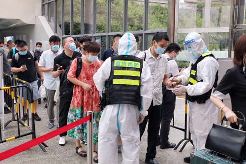 圖為7月25日,執(zhí)勤人員在宜興高鐵站對出站人員進行疫情期間例行查驗。