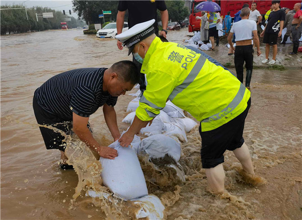 圖為湖北襄陽(yáng)民警正在與群眾一起用沙袋筑壩擋水。