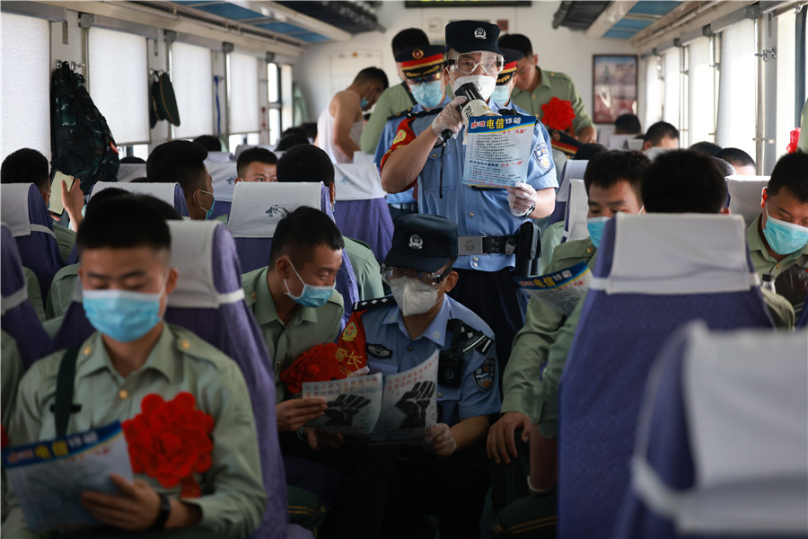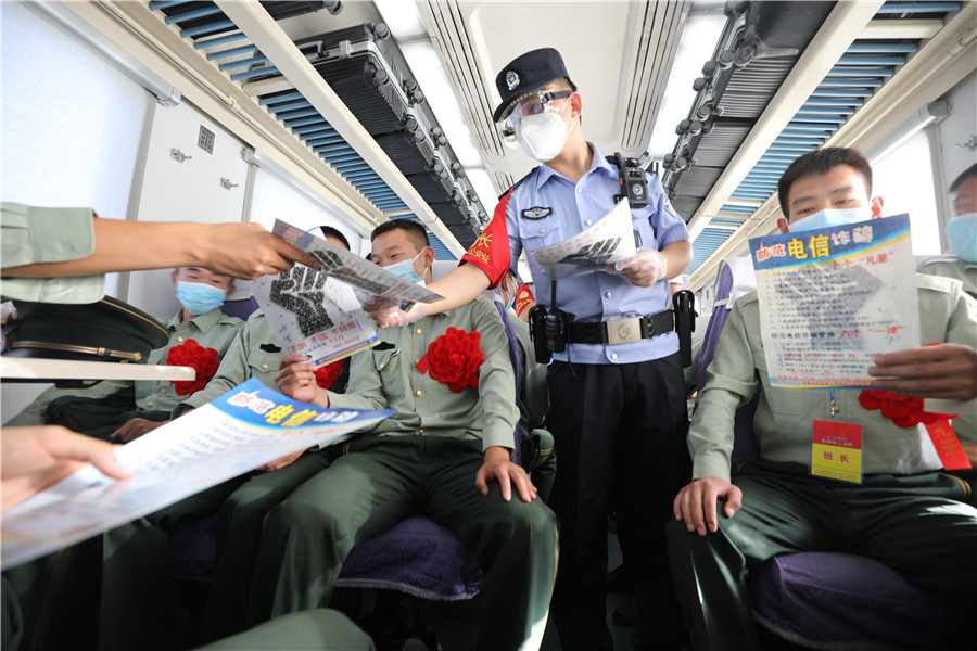 9月1日,由喀什開往西安的T270次列車,迎來一批退伍士兵旅客,烏魯木齊鐵路公安局庫爾勒公安處乘警支隊值乘民警在做好列車值乘工作的同時,向退伍士兵開展了防范電信網(wǎng)絡(luò)詐騙法治宣講,切實保障退伍士兵安全歸鄉(xiāng)。