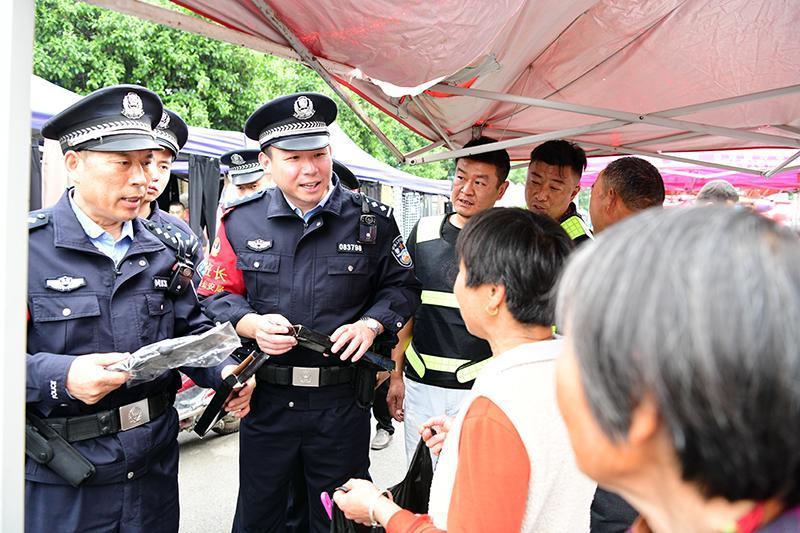 5月4日,安徽省阜陽市阜南縣公安局趙集派出所民輔警聯(lián)合治安隊(duì)員在集市上提醒群眾注意安全防范。針對農(nóng)村集市物品、資金、人員流動量大的特點(diǎn),阜南縣公安局趙集派出所聯(lián)合鎮(zhèn)政府治安辦組織民輔警和治安員開展集市不間斷巡邏,嚴(yán)防盜竊等侵財(cái)性案件發(fā)生,提升群眾安全感。