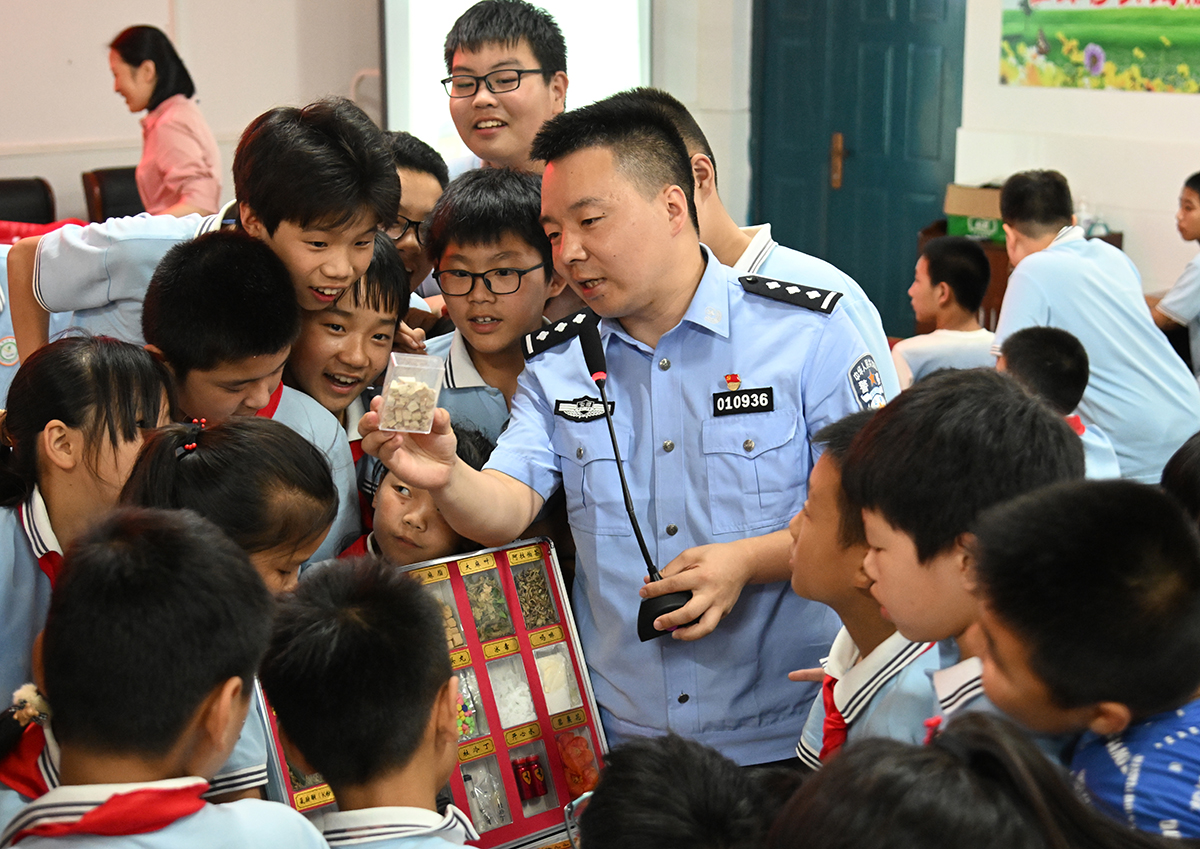 6月21日,安徽省蕪湖市公安局鏡湖分局荊方派出所聯(lián)合轄區(qū)街道組織開展以“禁毒記心間,人生不‘毒’行”為主題的禁毒宣傳進校園活動。民警和街道工作人員來到方村小學(xué),采取講座、識別毒品種類、有獎問答、禁毒簽名等方式,讓學(xué)生們從小樹立禁毒意識。