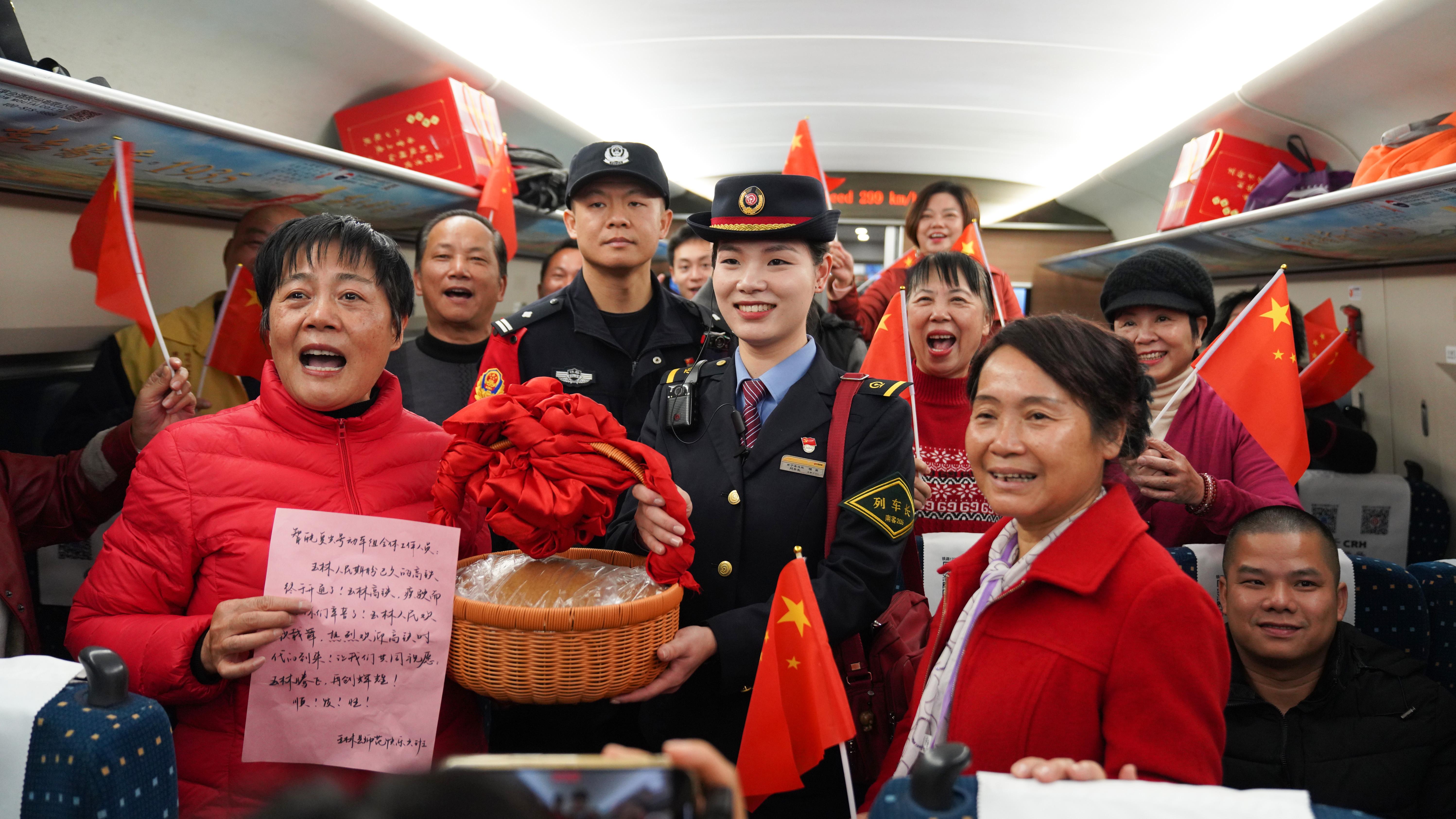 圖為首發(fā)列車G5514次列車乘警與旅客在車廂合影紀(jì)念南珠高鐵開通。
