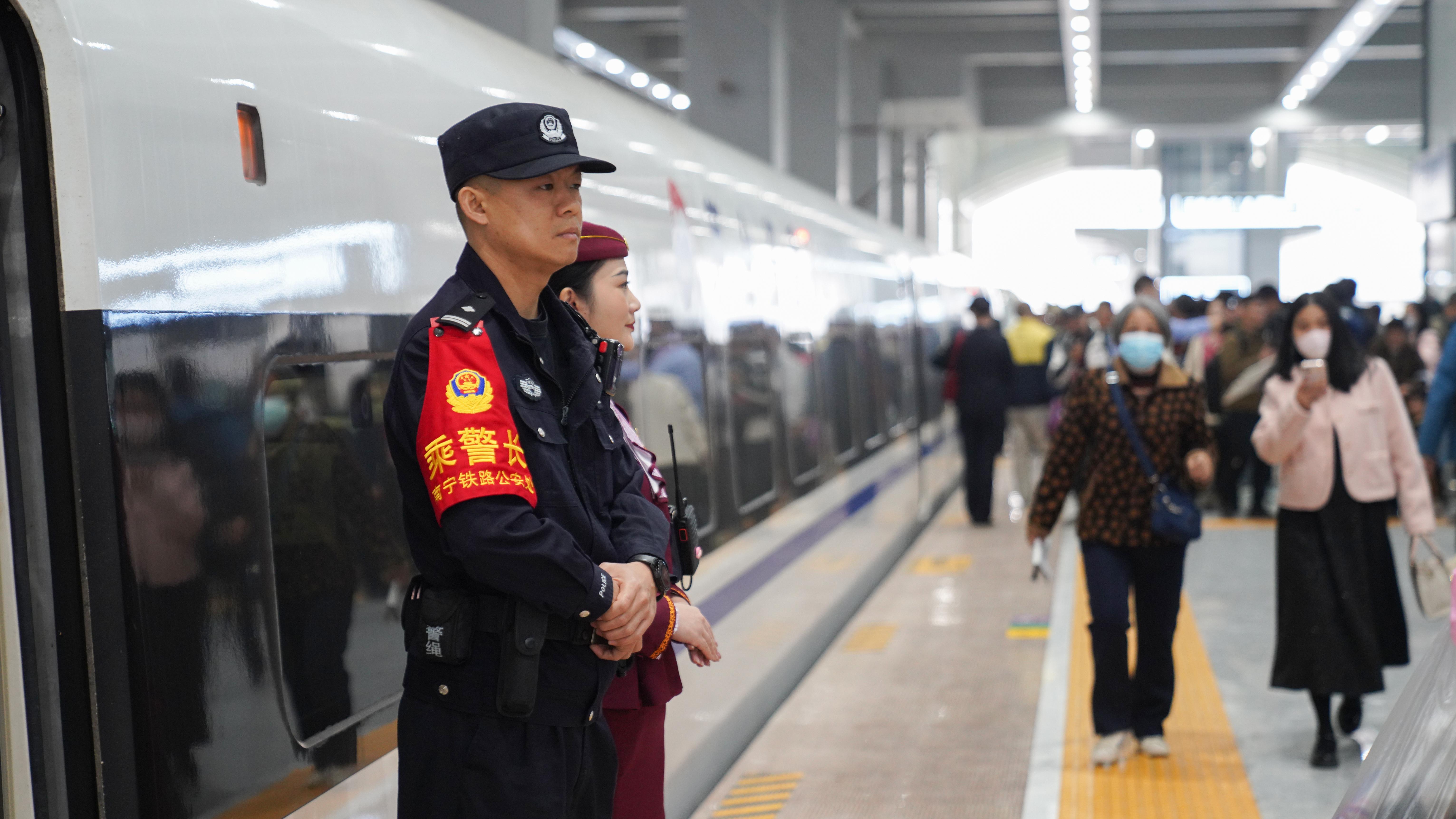 12月30日,南珠高鐵南寧至玉林段開通運(yùn)營。南寧鐵路公安局南寧公安處民警在南珠高鐵上維護(hù)列車秩序,保障人民群眾安全,護(hù)航南珠高鐵平安運(yùn)行。