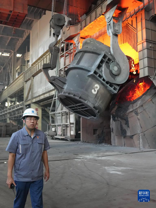 邯寶煉鋼廠特檔技術(shù)主管、轉(zhuǎn)爐車間副主任唐笑宇從轉(zhuǎn)爐附近經(jīng)過(2022年9月7日攝)。新華社記者 楊世堯 攝