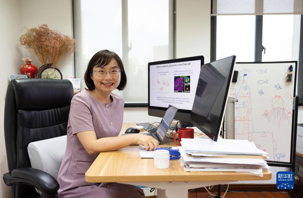 陳玲玲在中國(guó)科學(xué)院分子細(xì)胞科學(xué)卓越創(chuàng)新中心辦公室留影,右側(cè)是她女兒的畫作(2022年8月11日攝)。新華社記者 金立旺 攝