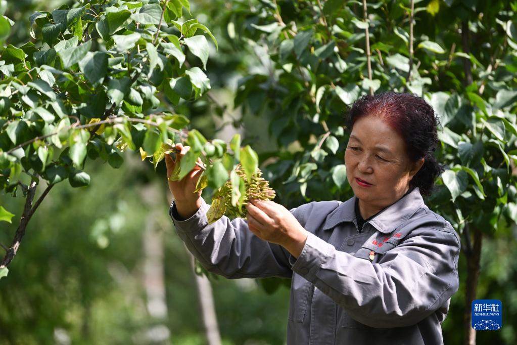 在青海省西寧市林業(yè)科學(xué)研究所的培育基地內(nèi),張錦梅在查看丁香生長情況(9月14日攝)。新華社記者 張龍 攝
